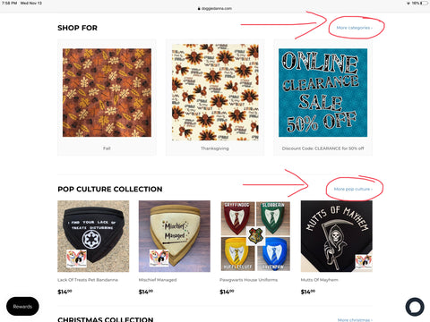 All you need to do is scroll down on the home page to Shop For and then click More Categories to see every collection that we have. For instance you might be looking for the Christmas collection, just click on Christmas to see every Christmas holiday bandannas that are available.
